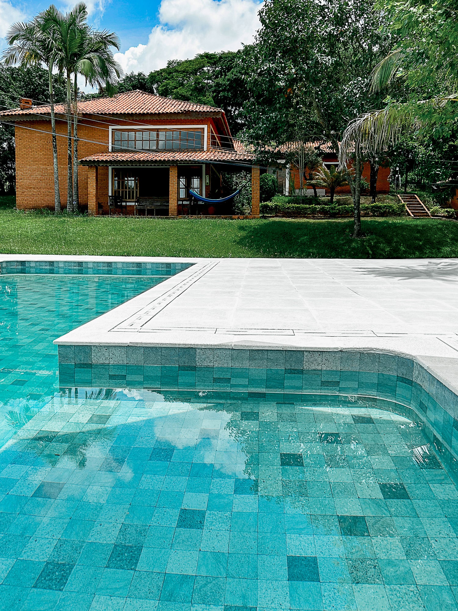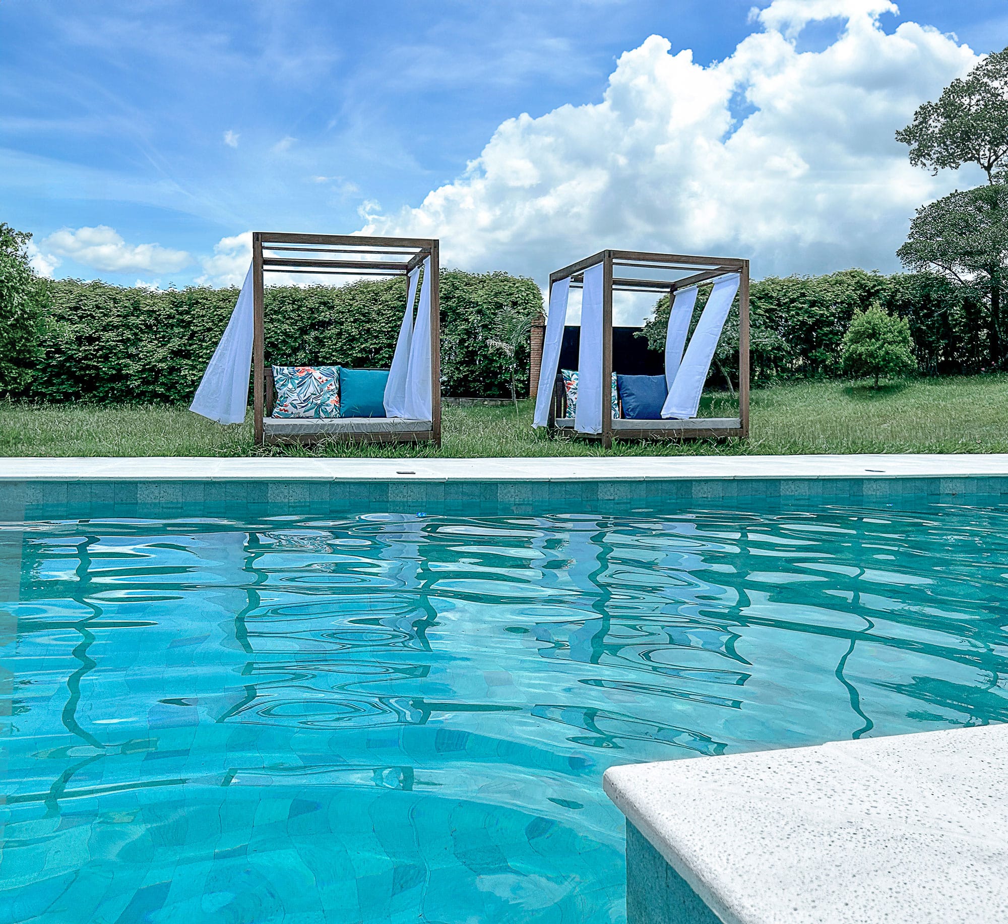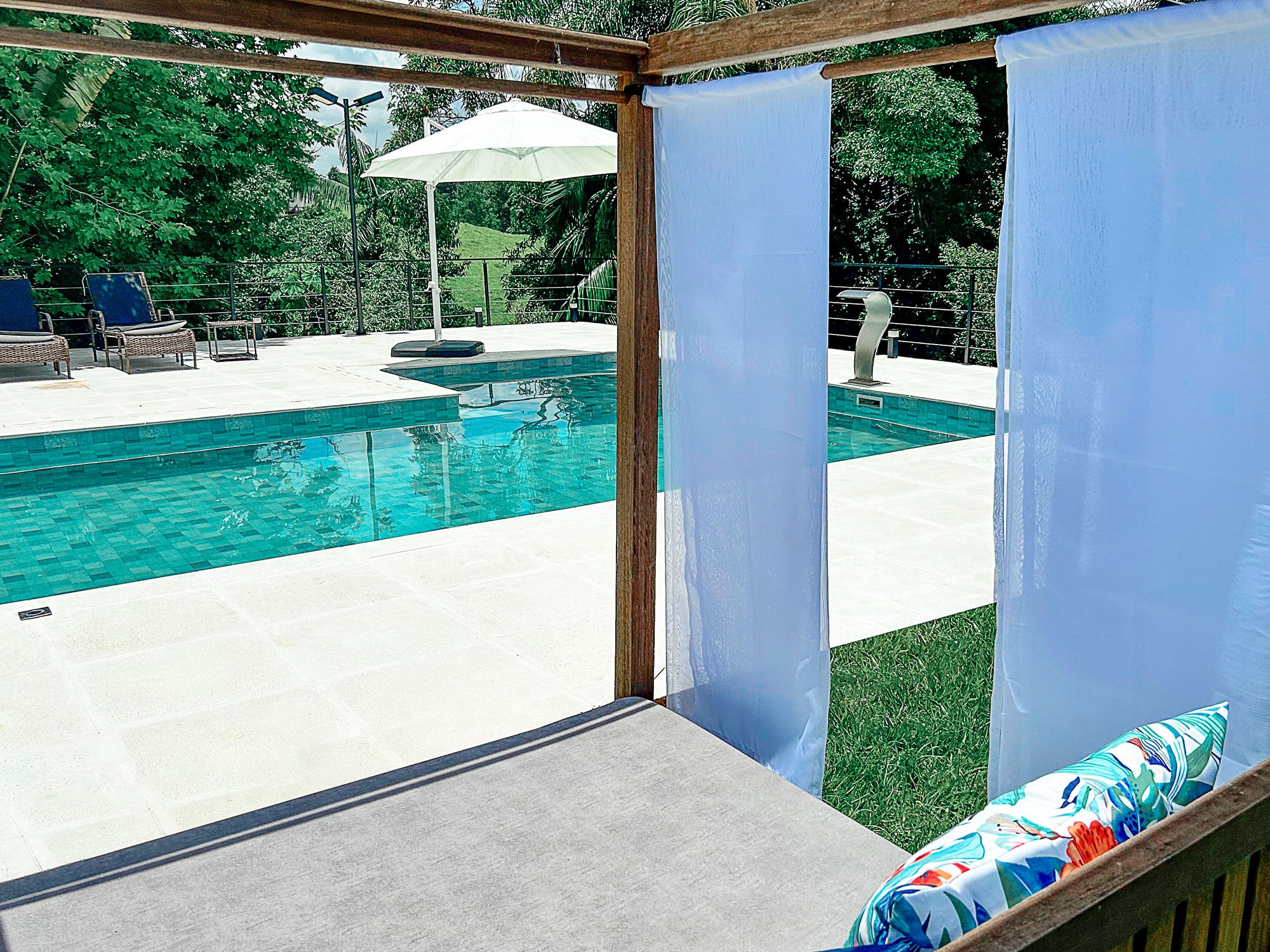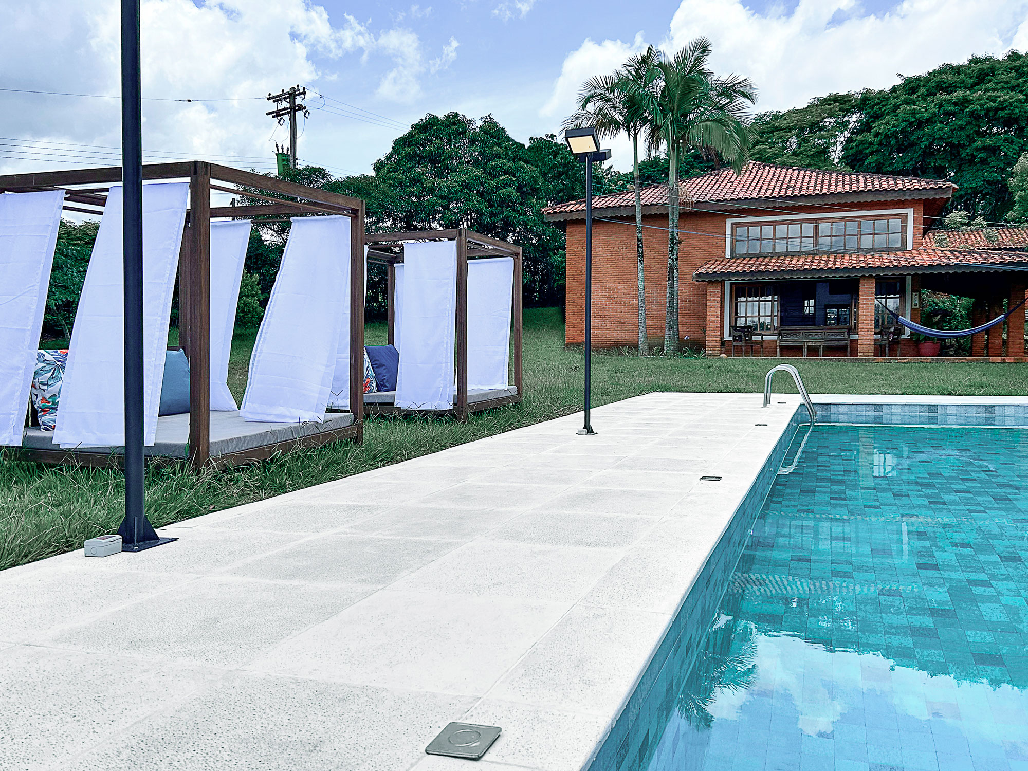 2 charmosos bangalôs ficam em frente à linda piscina de 10x4 m com cascata e piso em pedra atérmica, que garante ao visitante muito conforto mesmo nos dias de muito calor.