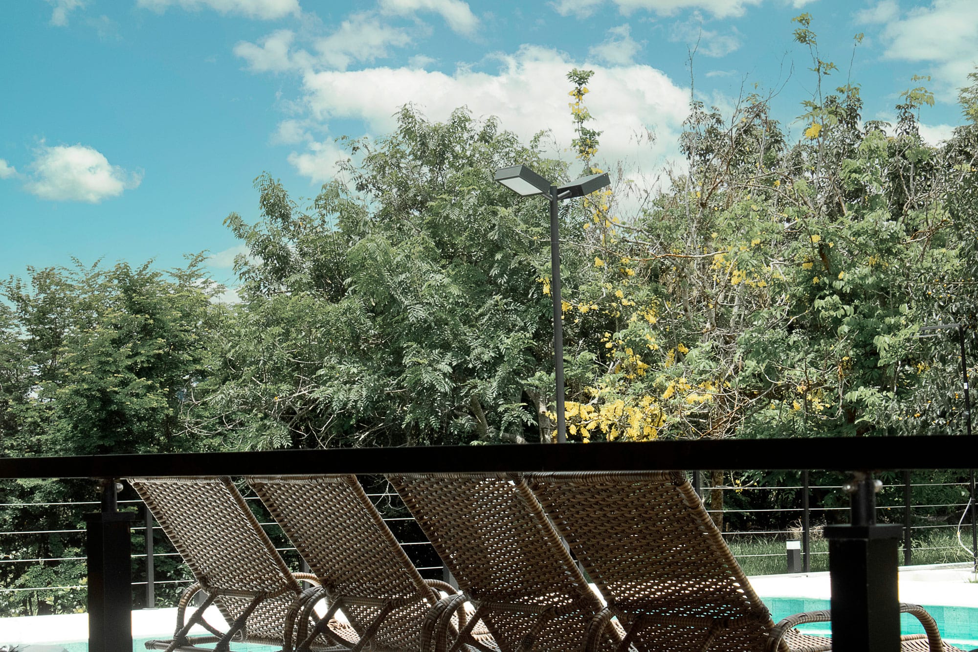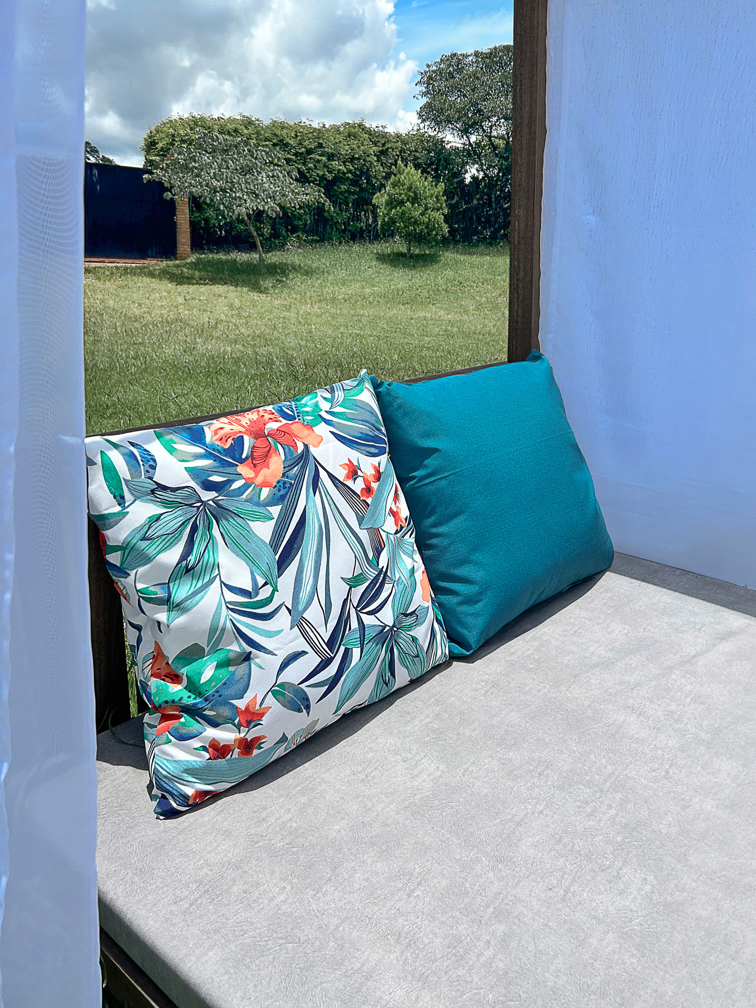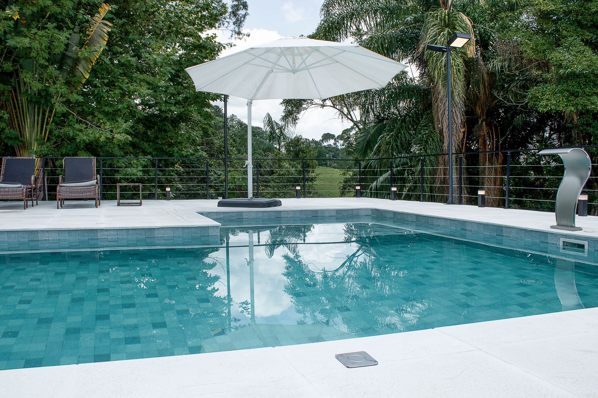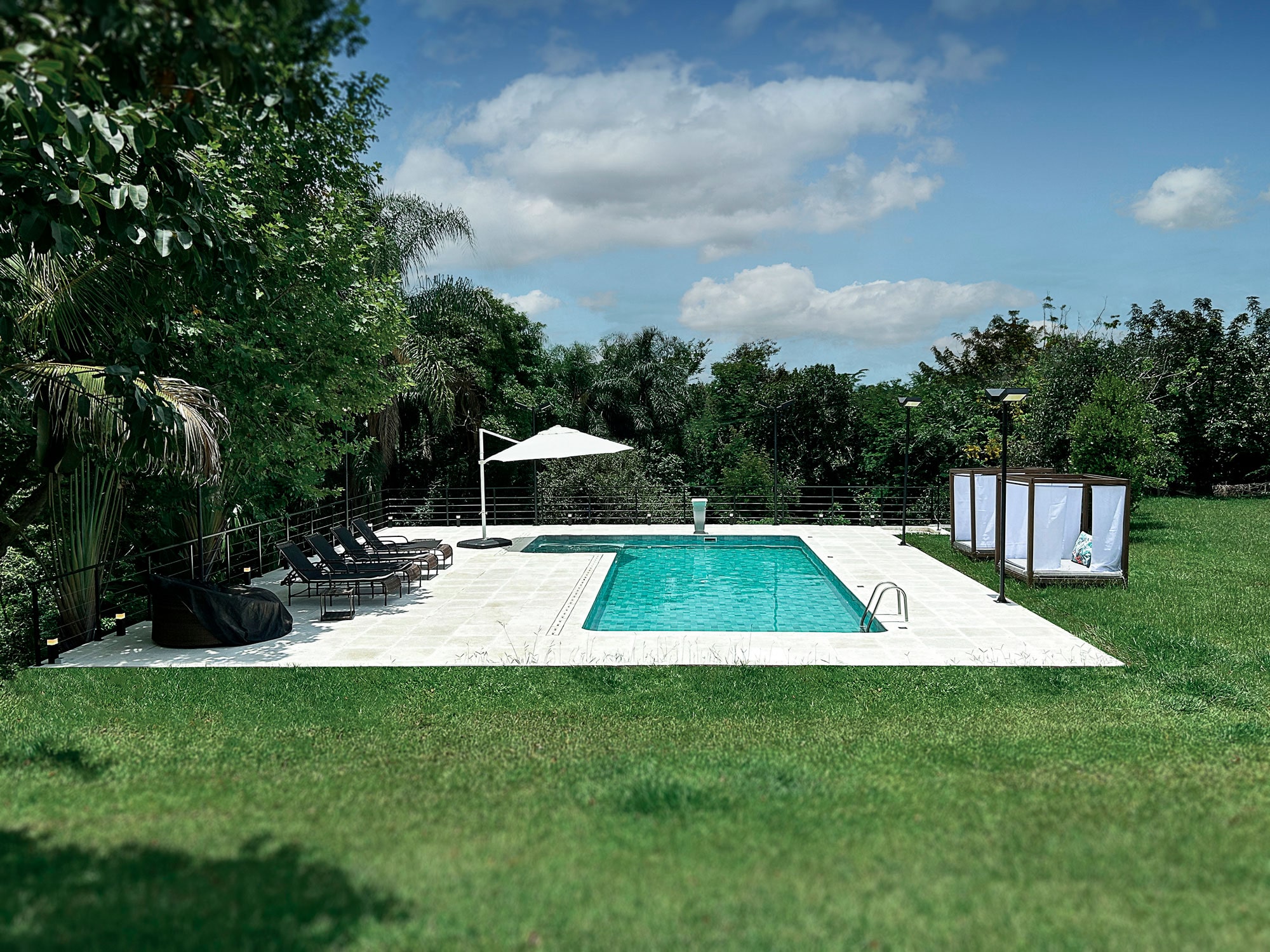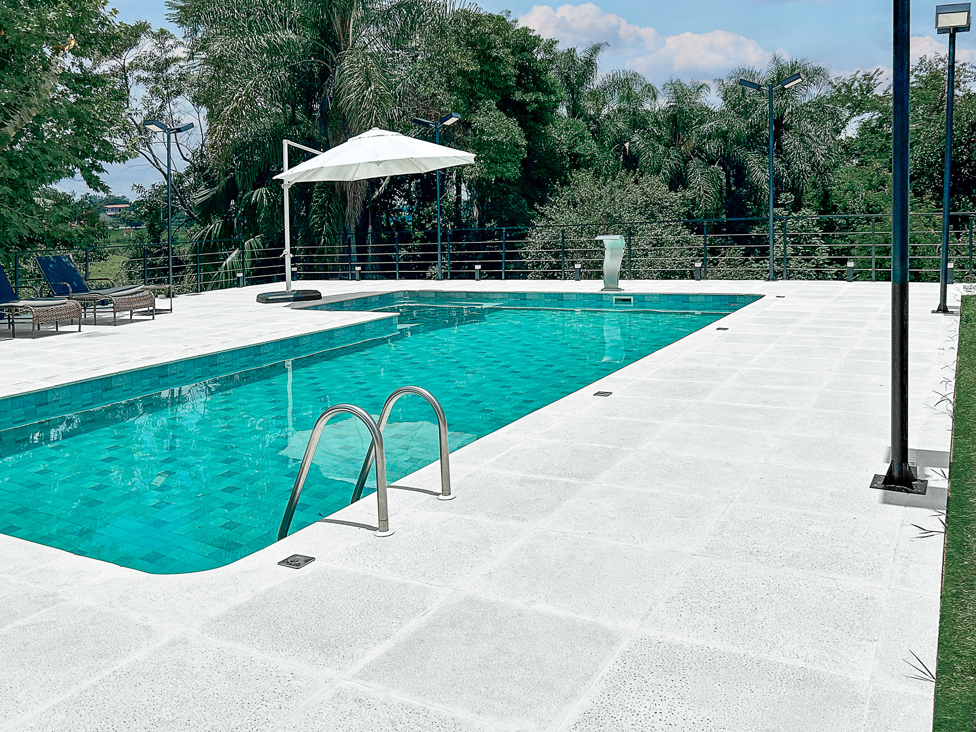 2 charmosos bangalôs ficam em frente à linda piscina de 10x4 m com cascata e piso em pedra atérmica, que garante ao visitante muito conforto mesmo nos dias de muito calor.